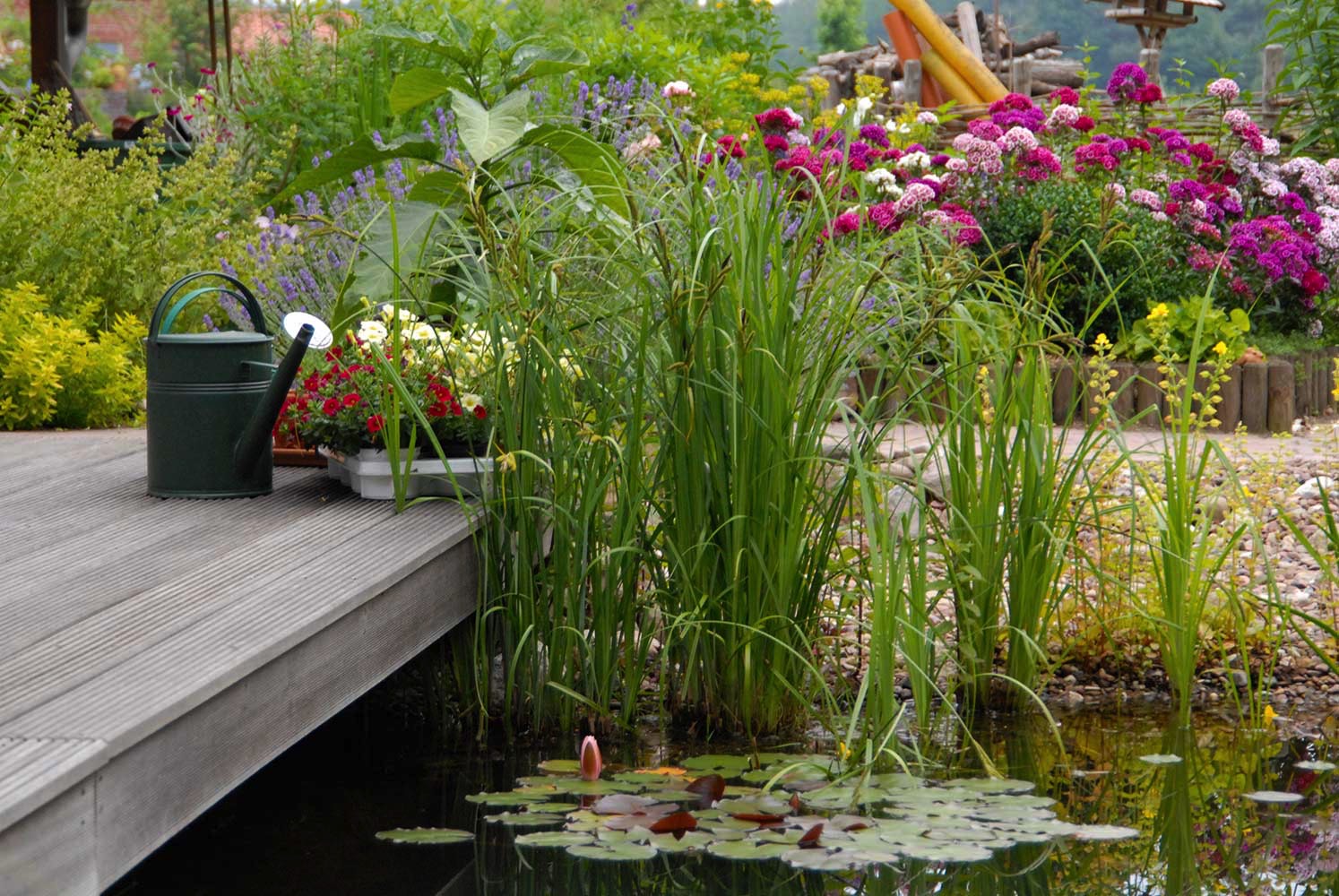 Holzterasse und Gartenteich mit Pflanzen